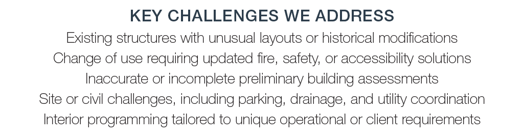 Every building and site comes with its own set of challenges: structural quirks, outdated systems, code requirements, or unique client needs. At JDI, we embrace these complexities, combining deep technical expertise with creative design to deliver solutions that work for the people, space, and operations.