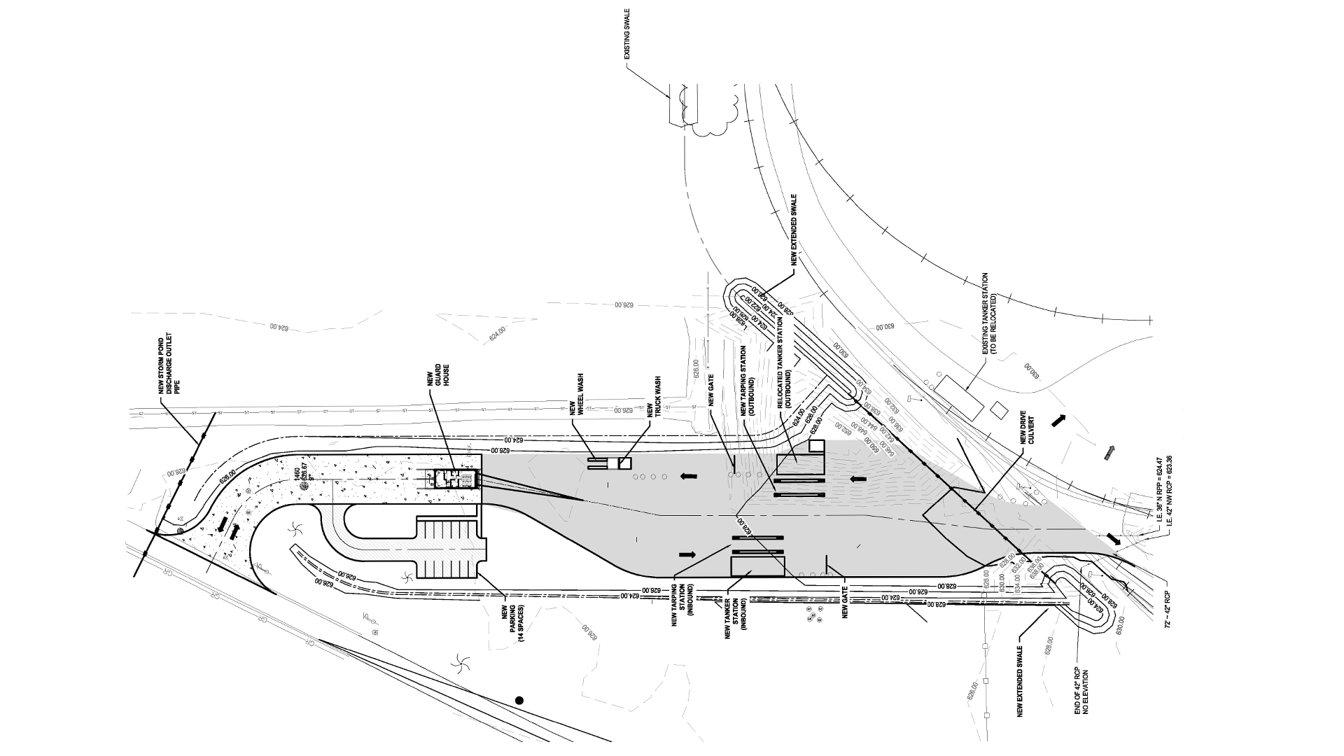 Currently, the client is seeking to address additional site challenges and capitalize on newly acquired land to the north. The goal is to expand the site layout to further improve vehicle circulation, safety, and efficiency. In addition to traffic flow enhancements, the facility currently lacks a guard shack and an effective means of tracking vehicle traffic in and out, two concerns being prioritized in the next stage of development.